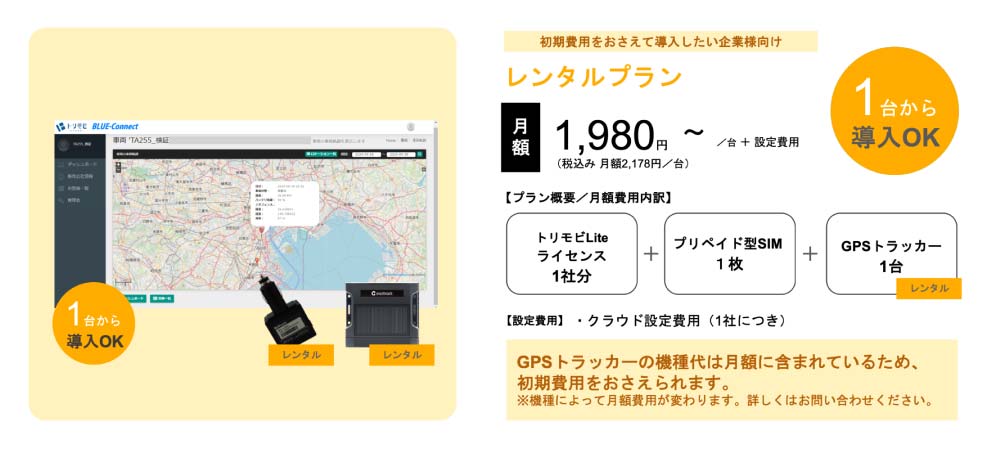 トリモビLiteはこれまでGPSトラッカーの機種を先に購入し月々のランニングコストを抑える「ベーシックプラン」のみのご案内でしたが、この度新しく「レンタルプラン」が増えました!