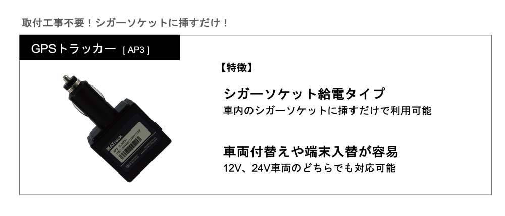 さらに、シガーソケット給電タイプのGPSトラッカー「AP3」をラインナップに追加し、端末の選択肢が増えました。