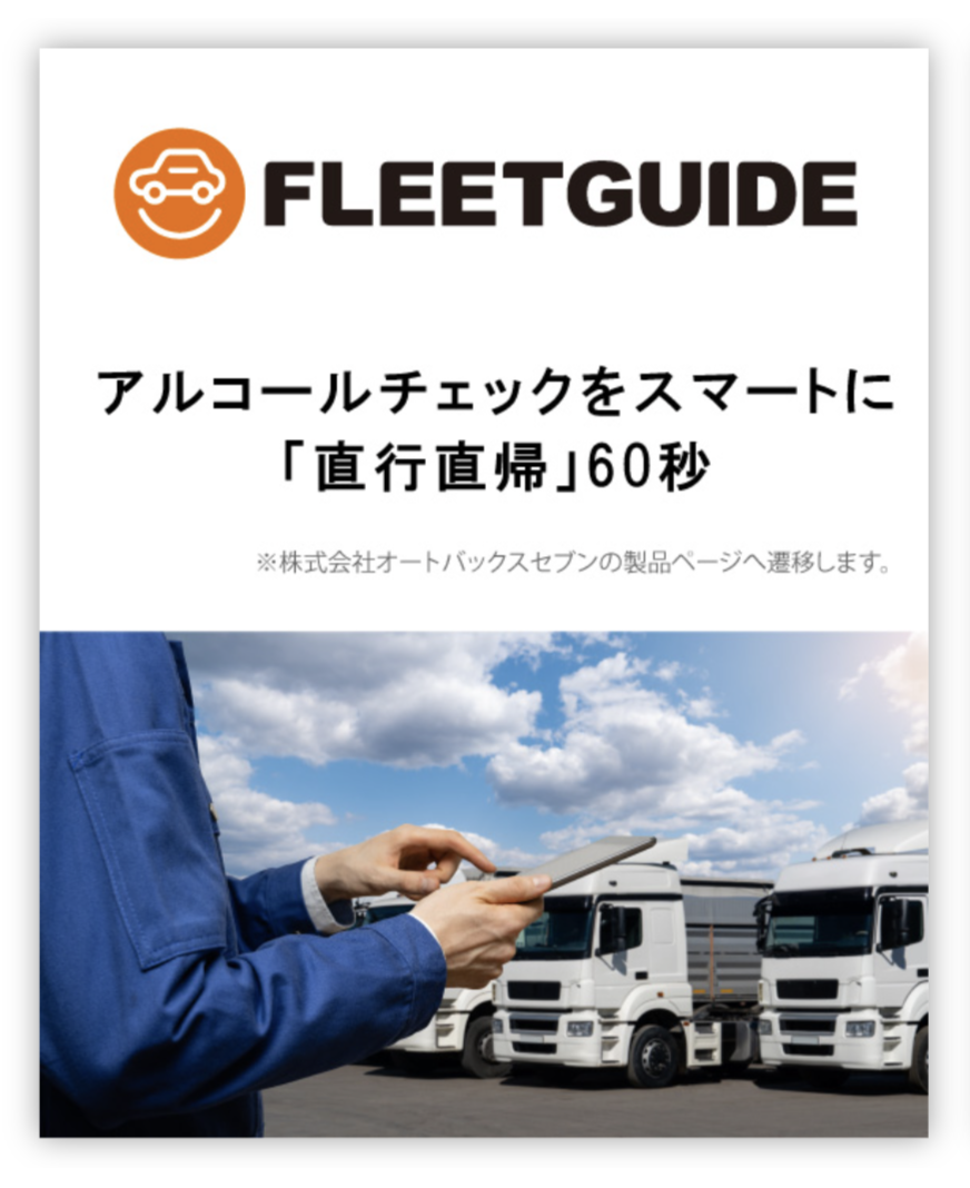 また、トライポッドワークスがオートバックスセブン社と共同開発している「FLEETGUIDE(フリートガイド)」は車両管理と合わせてアルコール検知器を連携し一元管理ができるサービスです。操作性や携帯性に優れ、測定結果についてもクラウド上で一括管理できる仕様となっており、多くの事業者で採用されています。